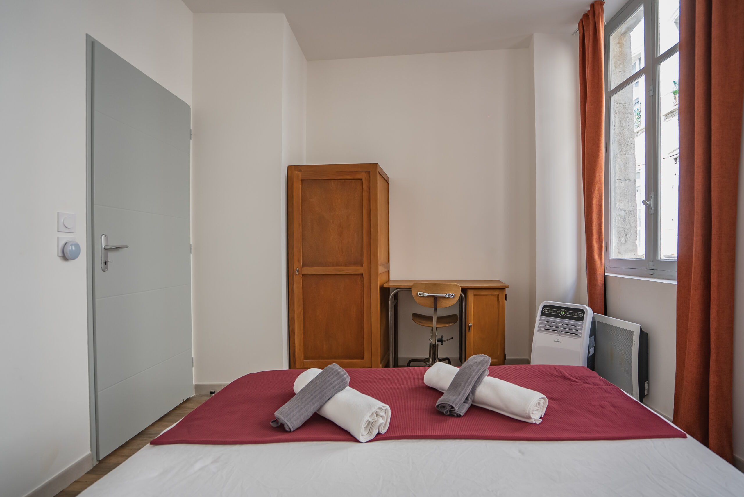 La chambre, apaisante et fonctionnelle, dispose d’un lit queen size (160×200), de rideaux terracotta, d’un grand placard et d’un climatiseur mobile pour rester au frais l’été.