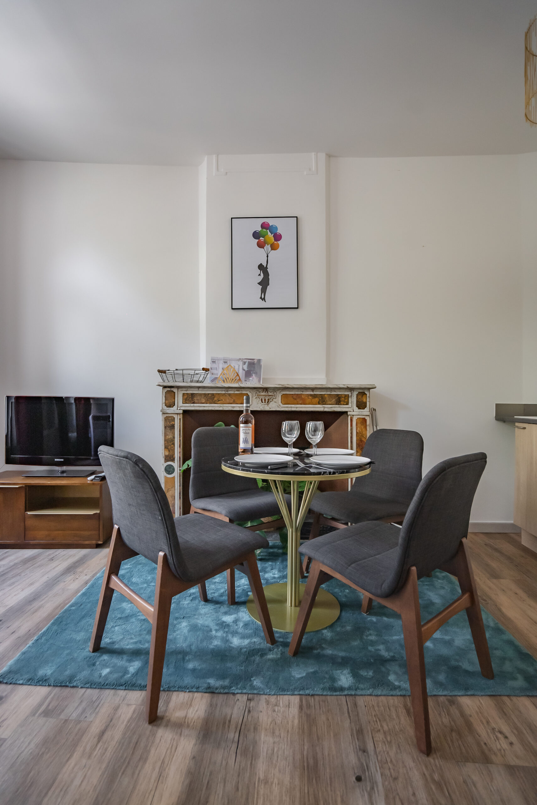 La cuisine ouverte est entièrement équipée (four, plaques, frigo, micro-ondes, Nespresso, bouilloire…), et la table ronde, entourée de quatre chaises confortables, invite aux repas et moments partagés.