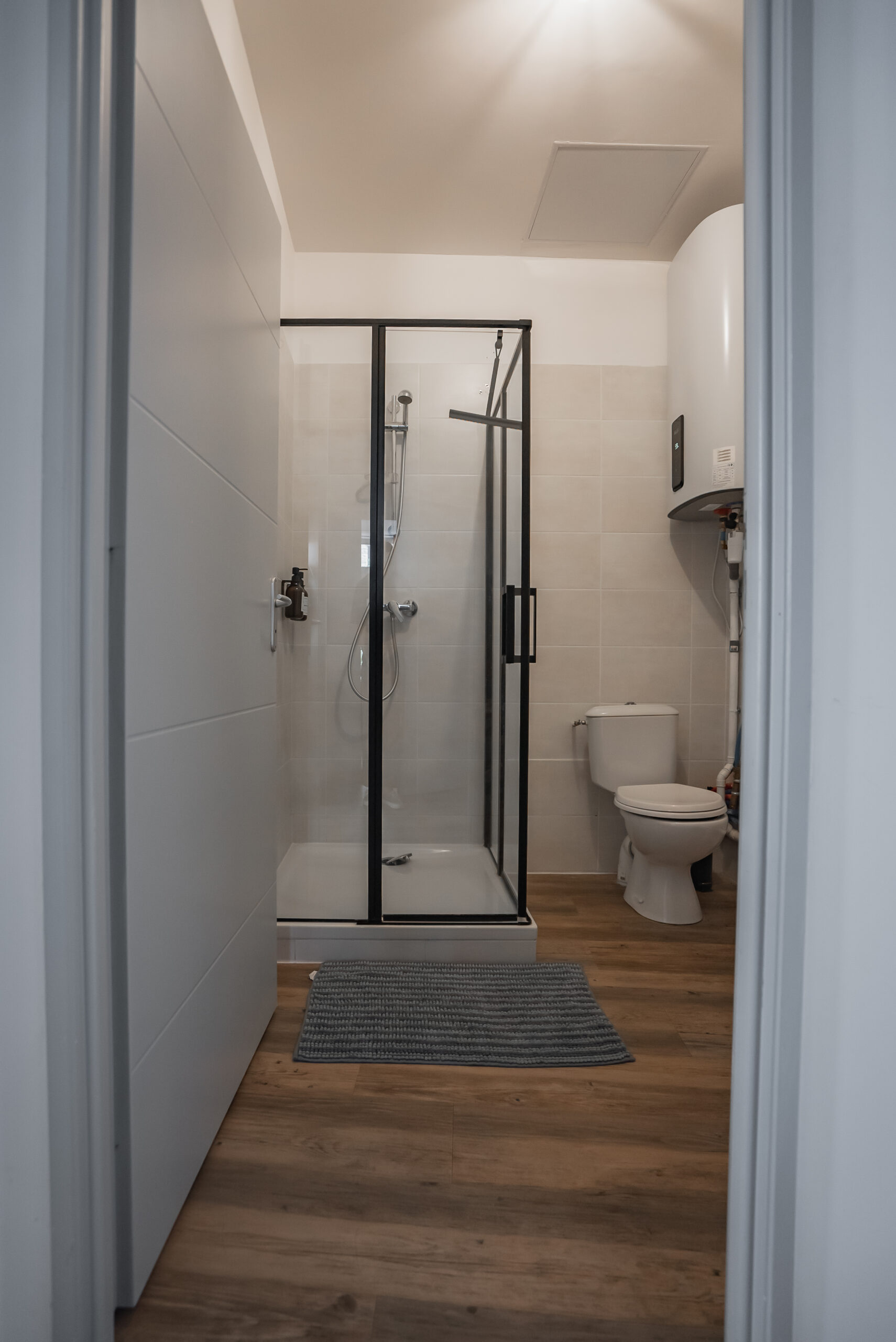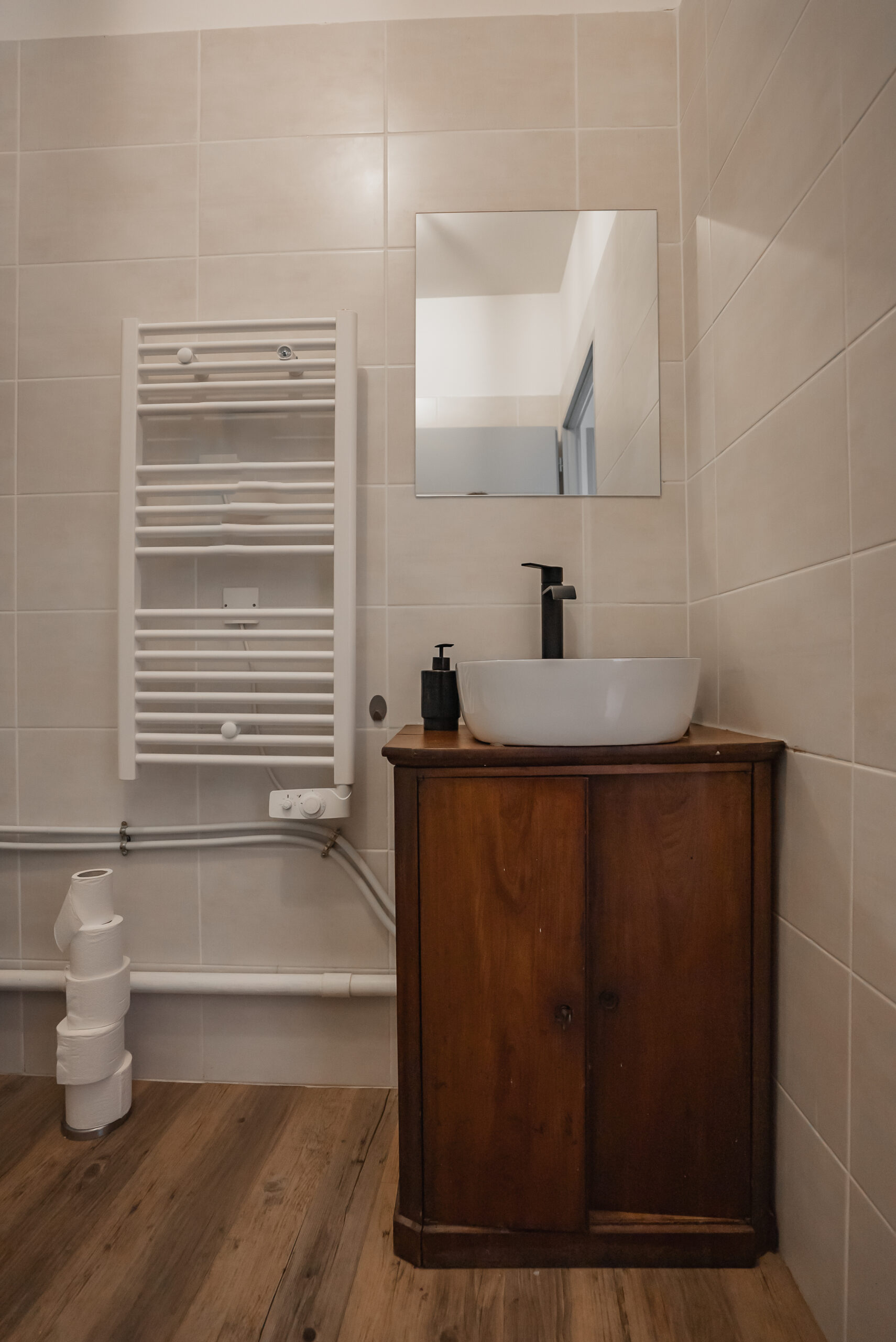 La salle de bain attenante est équipée d’une grande douche, d’un meuble vasque en bois ancien, de WC, d’un sèche-cheveux et des essentiels (gel douche, shampoing, après-shampoing).