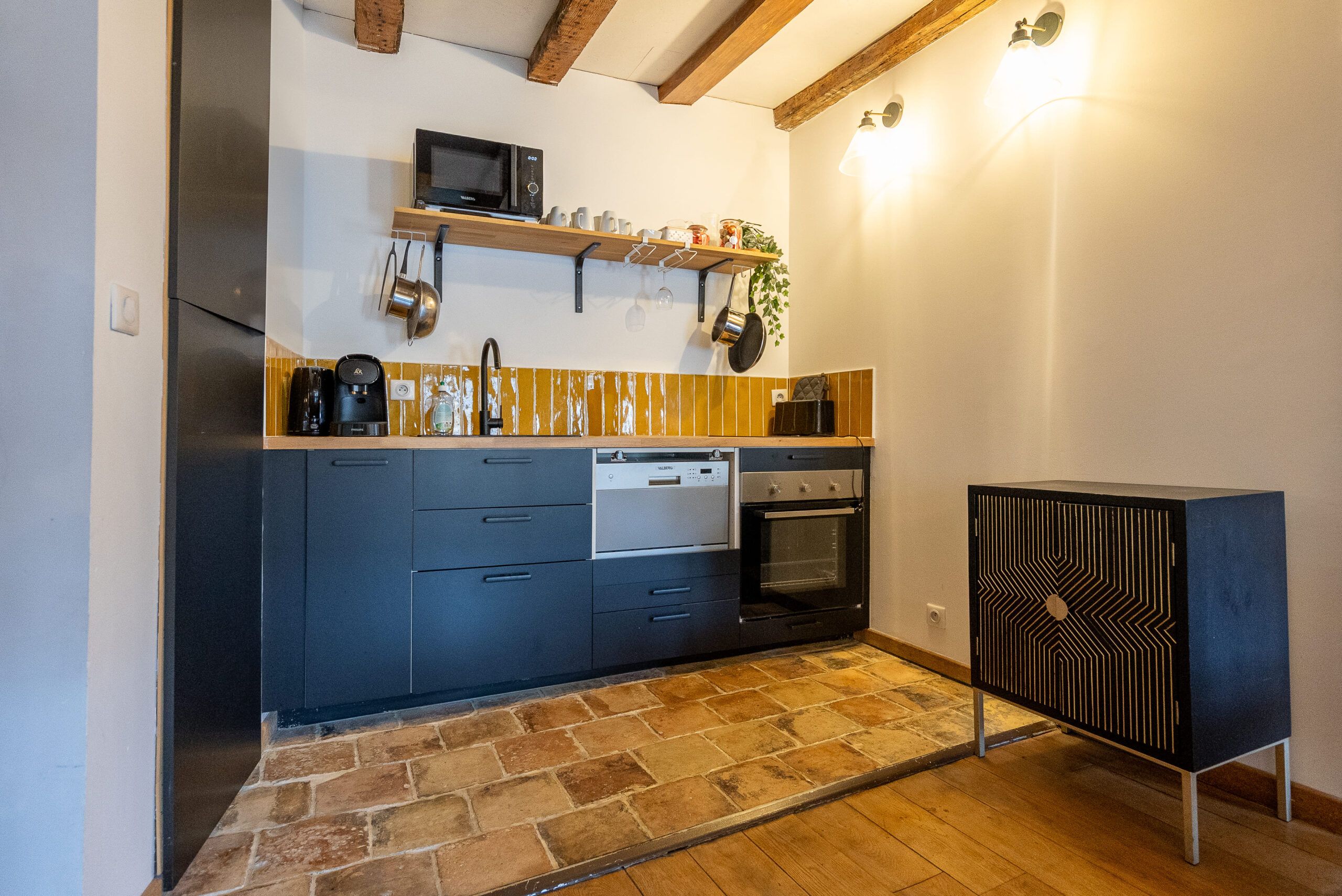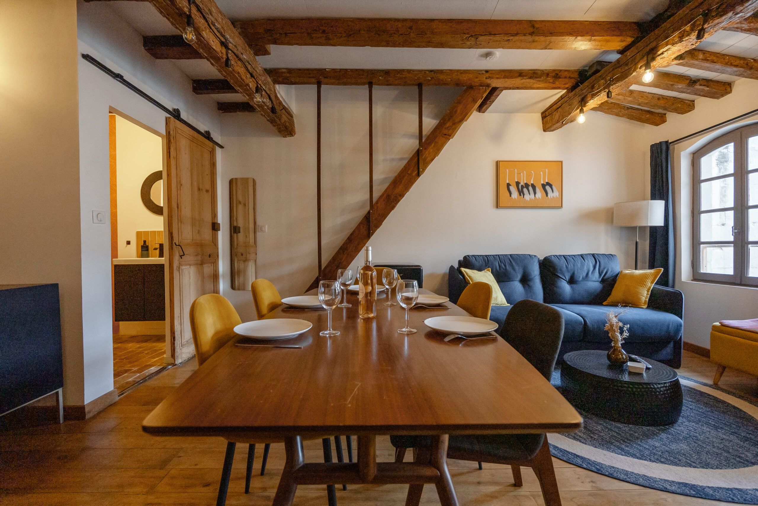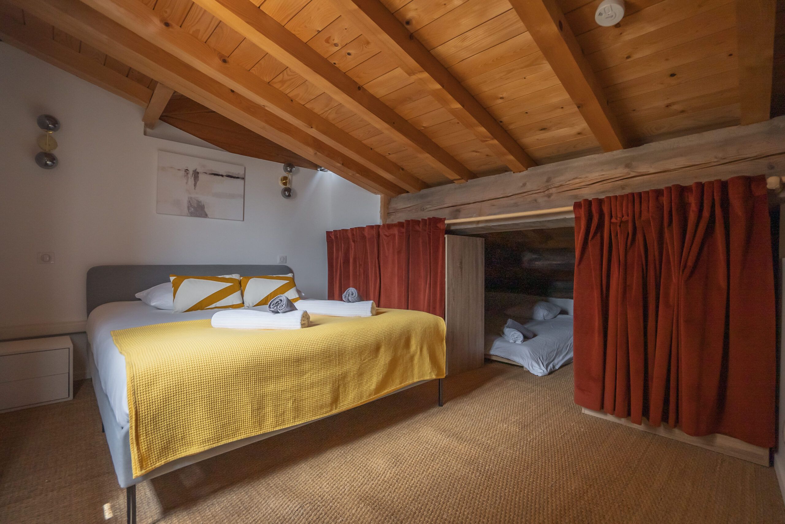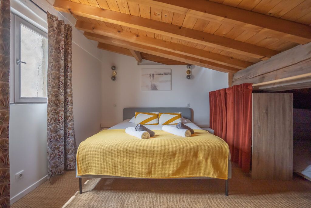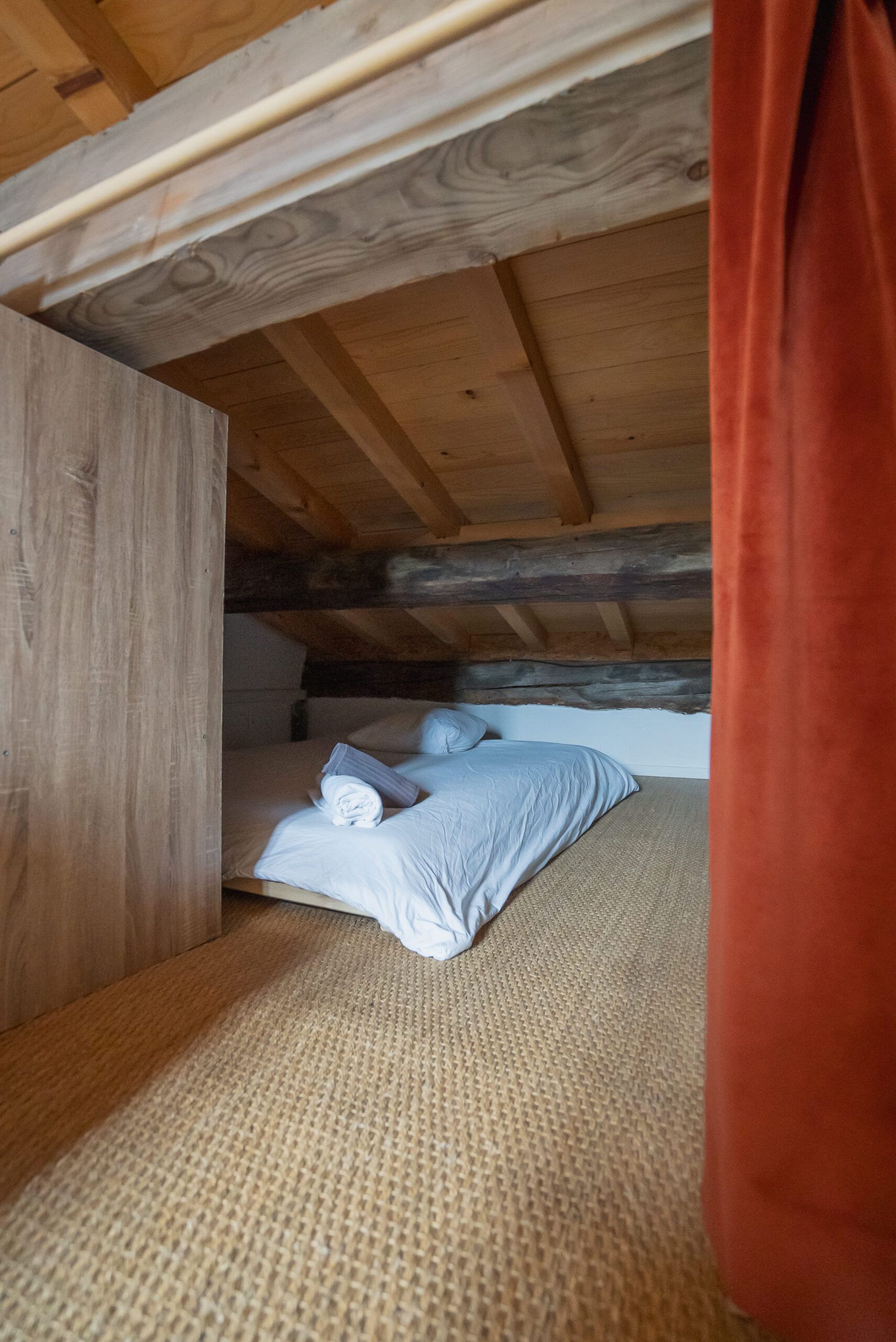 À l’étage, la chambre sous les toits mêle charme et confort : lit queen size (160×200), matelas épais, poutres apparentes, rideaux en velours… Et pour les familles ou les amis : un lit futon une place est discrètement installé derrière un rideau.