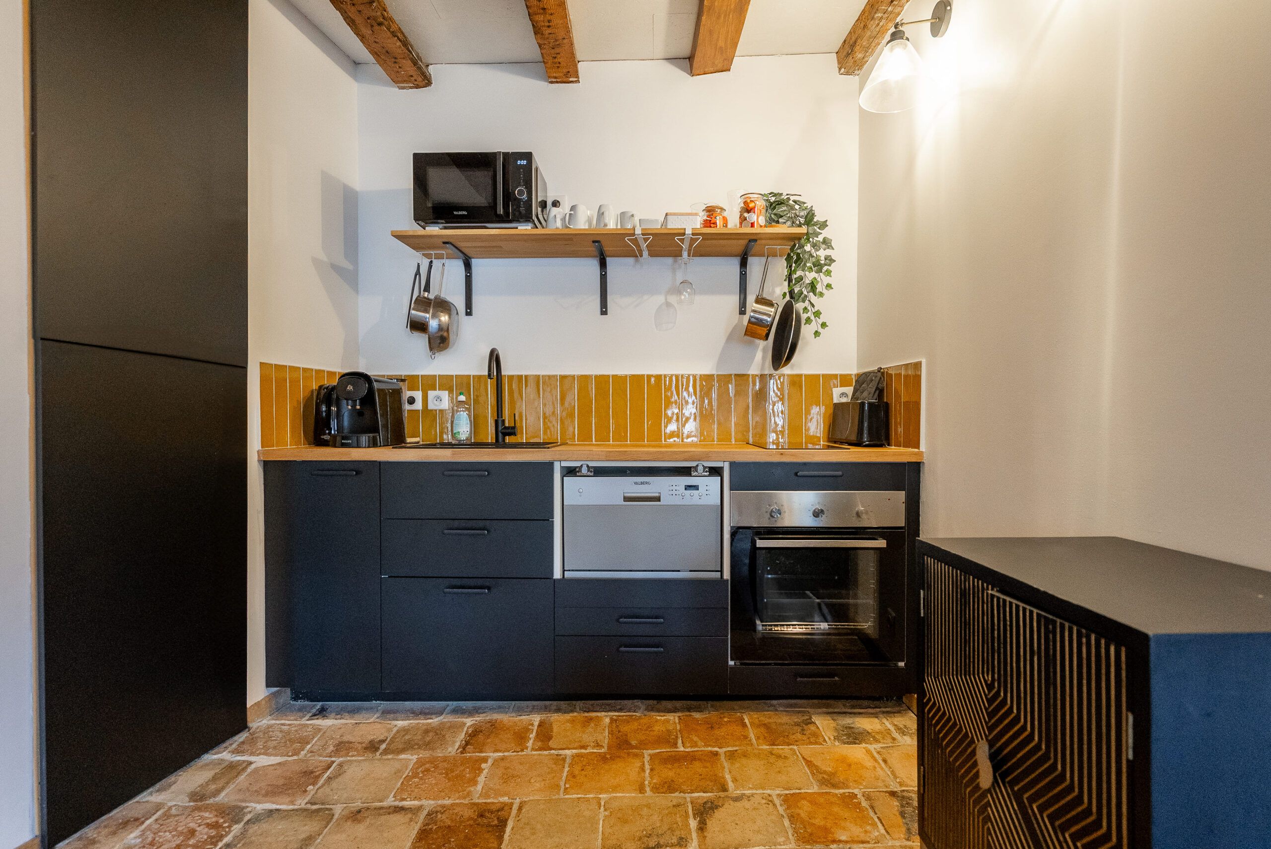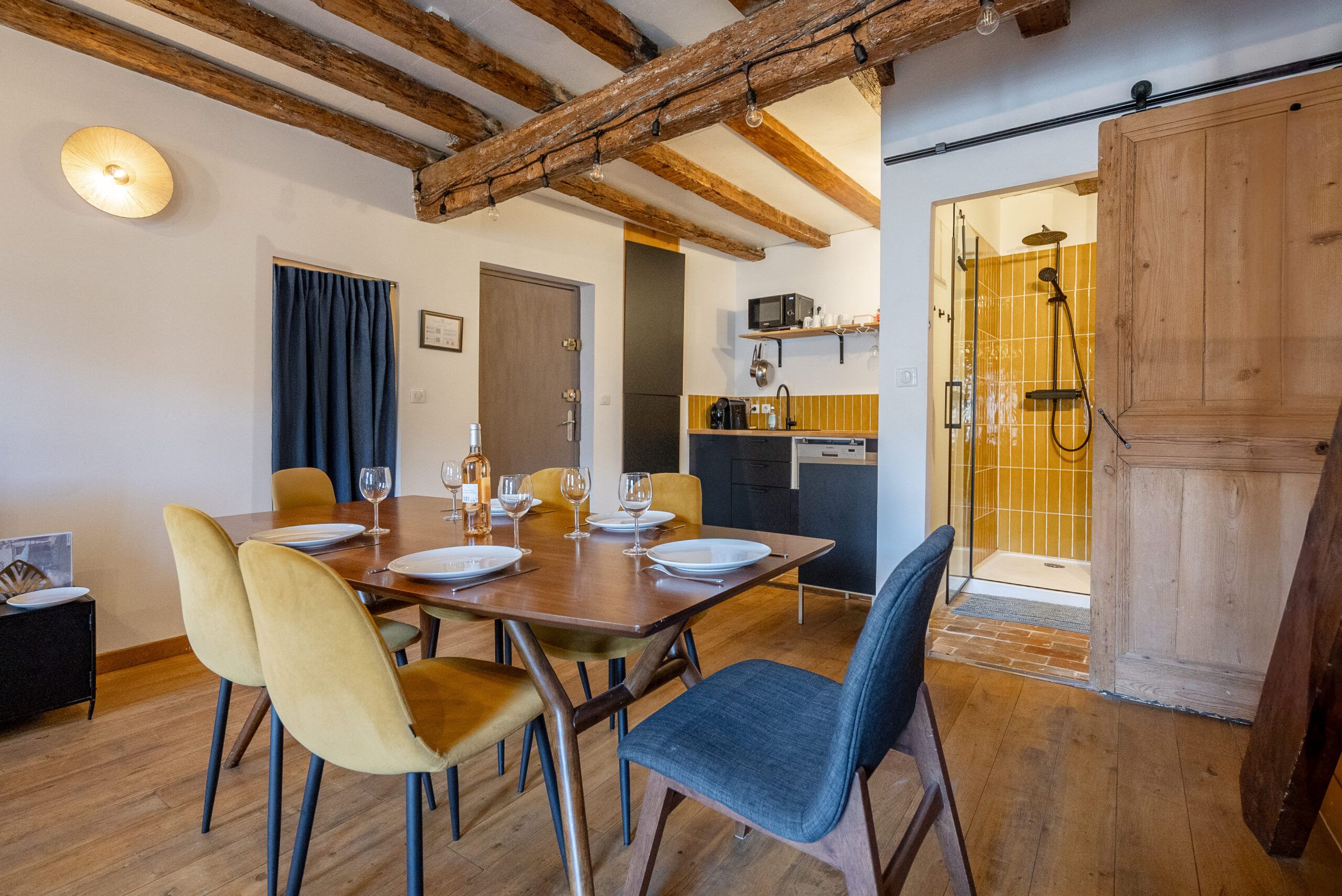 La cuisine ouverte est parfaitement équipée : four, plaques, lave-vaisselle, micro-ondes, Nespresso (avec capsules), bouilloire, grille-pain, vaisselle complète. La grande table en bois et ses six chaises colorées vous accueillent pour des repas conviviaux. Et le tout, climatisé, s’ouvre directement sur la terrasse… pour prolonger le moment à l’extérieur.