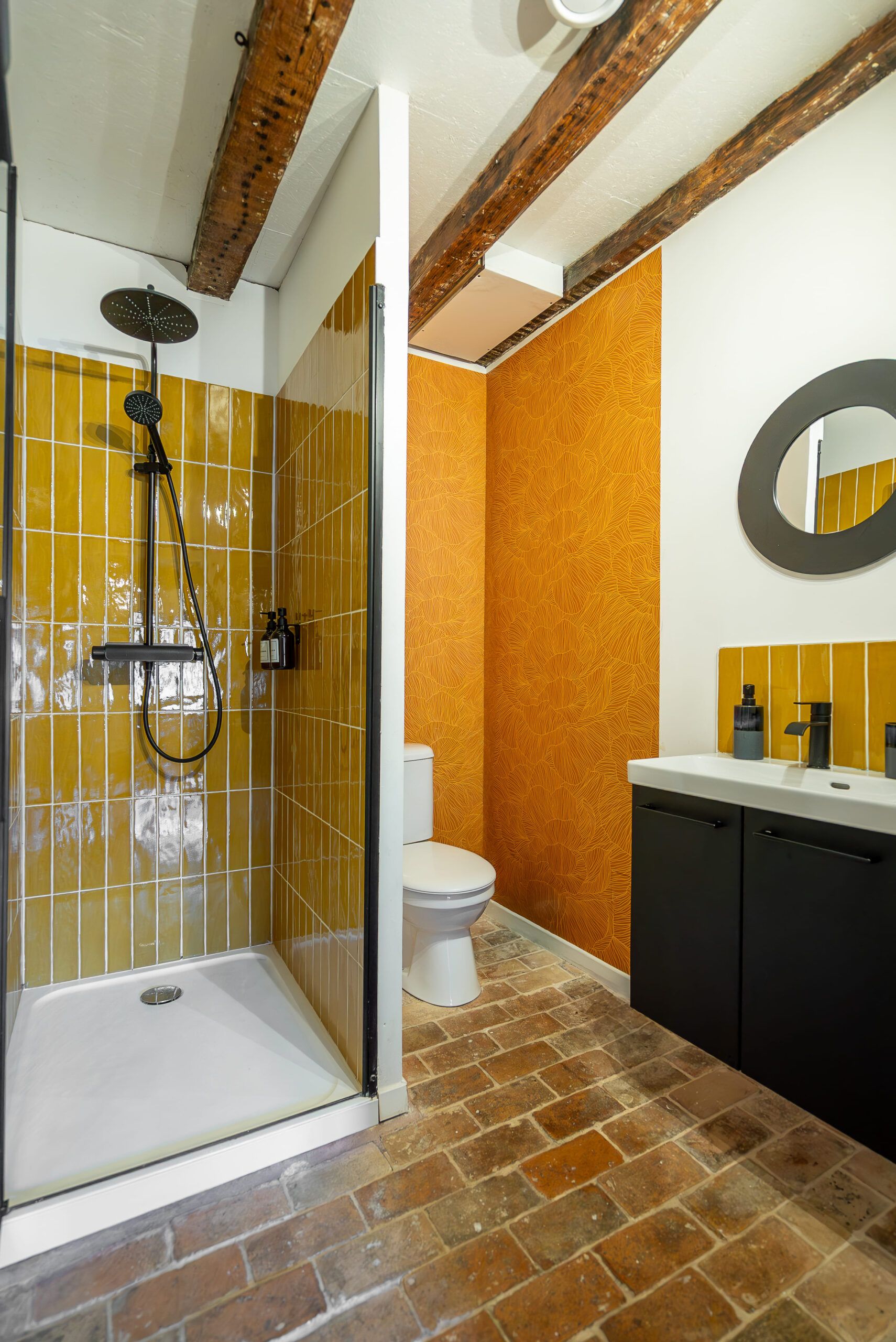 Au niveau principal, la salle de bain a été rénovée dans un style chaleureux : carrelage jaune ocre, poutres anciennes, sol en terre cuite. Vous y trouverez une grande douche, les WC, et les essentiels à disposition (gel douche, shampoing, après-shampoing, sèche-cheveux).