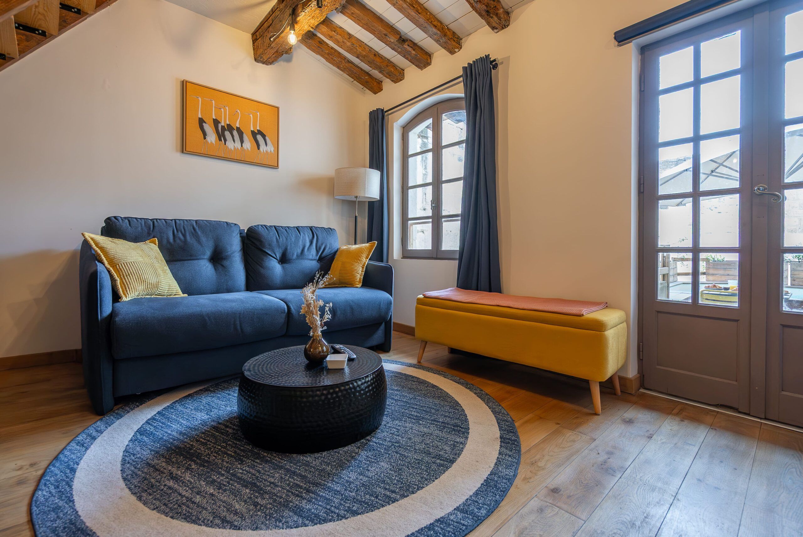 Un salon où l’on se sent bien, avec son canapé convertible bleu nuit (matelas confortable), ses poutres au plafond et sa déco mêlant touches safran et esprit contemporain.